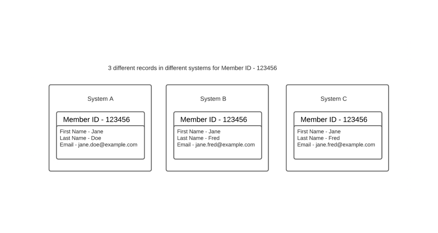 In another scenario, data duplication can be an issue where one system has three different member IDs. However, they are likely all the same person with potentially poor process, business logic or human error. Duplicate records could be created from these.