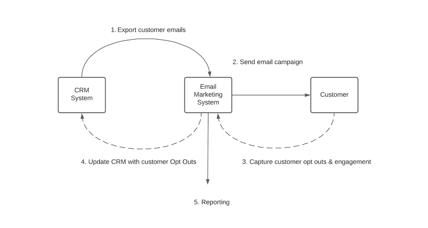 • Option one – could be to capture opt outs in the email marketing tool and export them back to the CRM to update the master record.