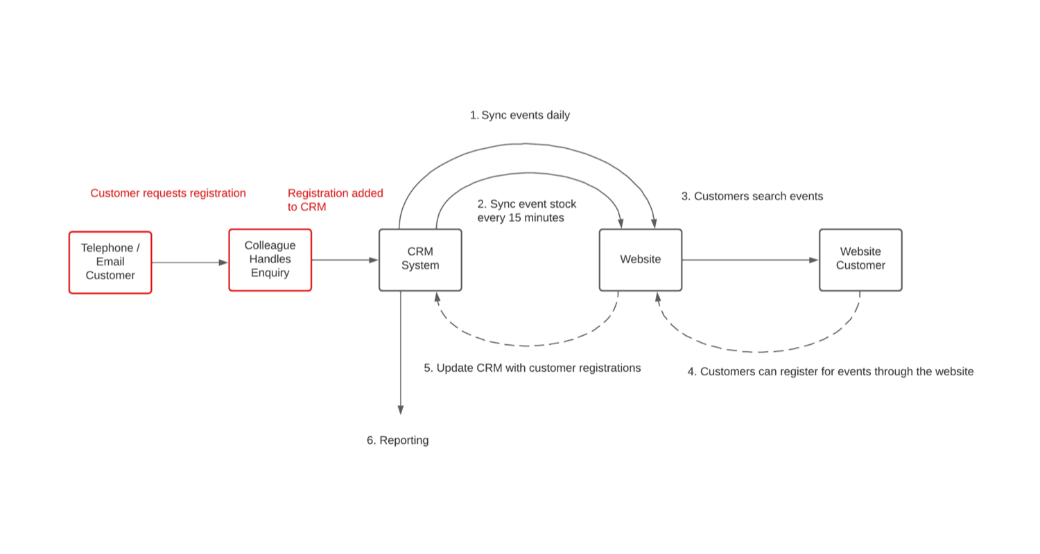 You would need to consider the primary records of events that are held in CRM or AMS. It’s also really important to consider that the website has up-to-date availability of spaces or stock.